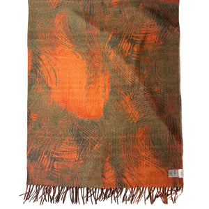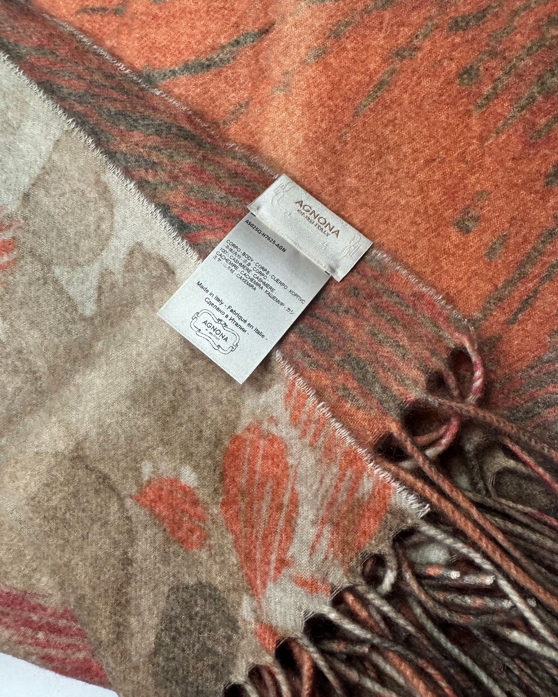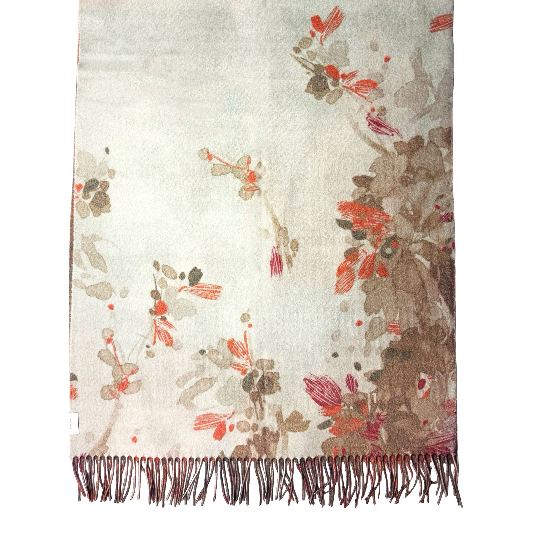 Authentic Agnona scarf, beige taupe orange floral, reverse side with orange dark green design (two designs), top quality medium weight cashmere fabrics, fringe, made in Italy. Authentic Agnona Scarves, women collection scarves and soft accessories at outlet prices.