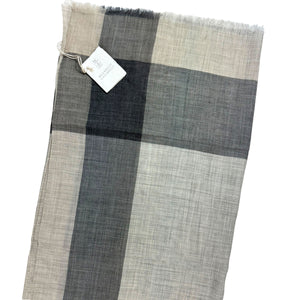 SALE - Women collection - Genuine Brunello Cucinelli scarf, beige black gray color block, 100% lightweight cashmere, short fringe, made in Italy. Authentic Brunello Cucinelli scarves and accessories at outlet prices.