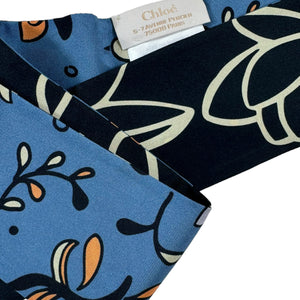 Genuine Chloé scarf, skinny twill silk floral design, bandeau/ twilly, navy/ blue, made in Italy. Discount women designer scarves online since 2005. Brand name silk scarves at outlet prices.