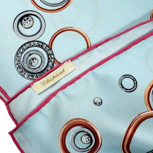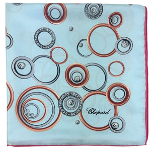 Genuine Chopard scarf, jewelry 'Happy Spirit' sky blue design, organic twill silk foulard, hand rolled borders, made in Italy. Great luxury gift for her, comes with Chopard gift box. Chopard is a high-end fashion brand from Geneve, Switzerland, specializing in high-end women accessories, watches and jewelry.
