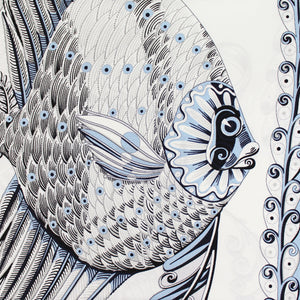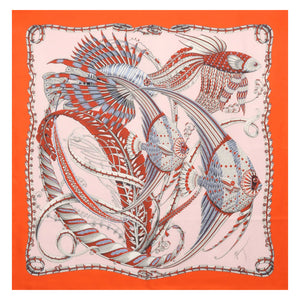 Four tropical fish, delicate and exotic, take center stage on this pure silk scarf. The details are meticulous and feminine, a testament to the silk artistry that distinguishes Ferragamo. It features a cursive signature along the edge and hand-finished details, elegantly encapsulating the scarf's exquisite craftsmanship and vibrant design.