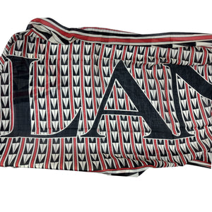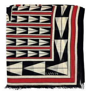 Genuine Lanvin scarf, dark red black white geometric design, lightweight soft wool, short eyelash fringe, made in Italy. Authentic Lanvin scarves, women collection accessories at outlet prices.