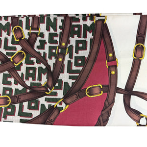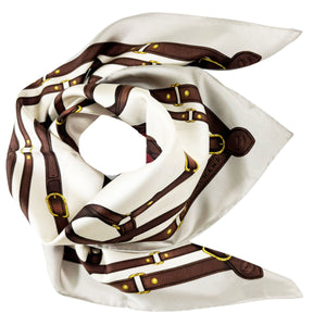 Genuine Longchamp scarf, signature equestrian belts designs brown white gray with logo detail, large twill silk square scarf, hand stitched borders, made in Italy. Discount women designer scarves at outlet prices, shop for genuine Longchamp Paris women accessories online.