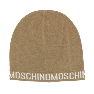 FINAL SALE: Genuine Moschino beanie hat, beige with Moschino logo print in white, wool/ cashmere blend, made in Italy. Stylish fashion, fun and quality