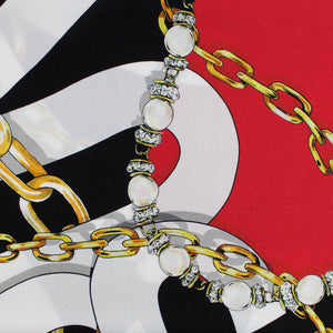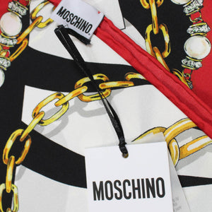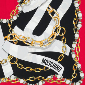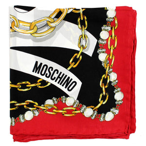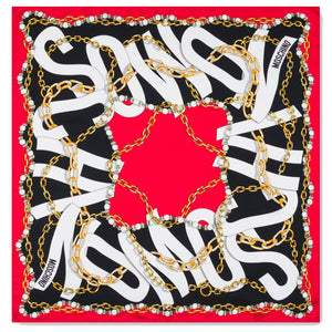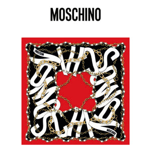 - SALE - Genuine Moschino scarf, elegant signature chain print and morphed effect maxi-logo lettering design, hand stitched red border, large 35" square, twill silk, made in Italy. Authentic Moschino scarves, women collection at outlet prices.