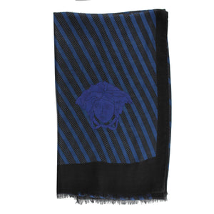 SALE - Fall/ Winter: Genuine Versace scarf with a black / dark blue / gray medusa design, fancy cashmere/ modal shawl, short fringe, made in Italy. Genuine Versace women collection - women designer scarves.