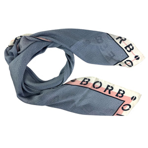 2025 Collection - Genuine Borbonese scarf, signature Eye of Partridge logo design in blue, light weight silk, no fringe, made in Italy. Authentic Borbonese women designer scarves, Italian quality accessories at outlet prices.
