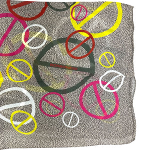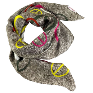 Genuine Borbonese scarf, brown beige Eye of Partridge with colorful large "screws" design, light weight silk, hand stitched borders, made in Italy. Authentic Borbonese women designer scarves, Italian women accessories at outlet prices.