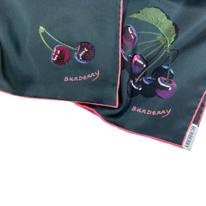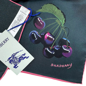 Luxury: Authentic Burberry scarf, twill silk, ivy (dark green- almost black) with luxury crystals/ hand painted cherries, hand stitched pink border, made in Italy. Genuine Burberry scarves, accessories and handbags at outlet prices.