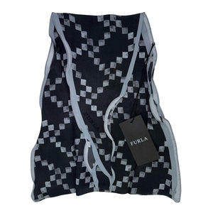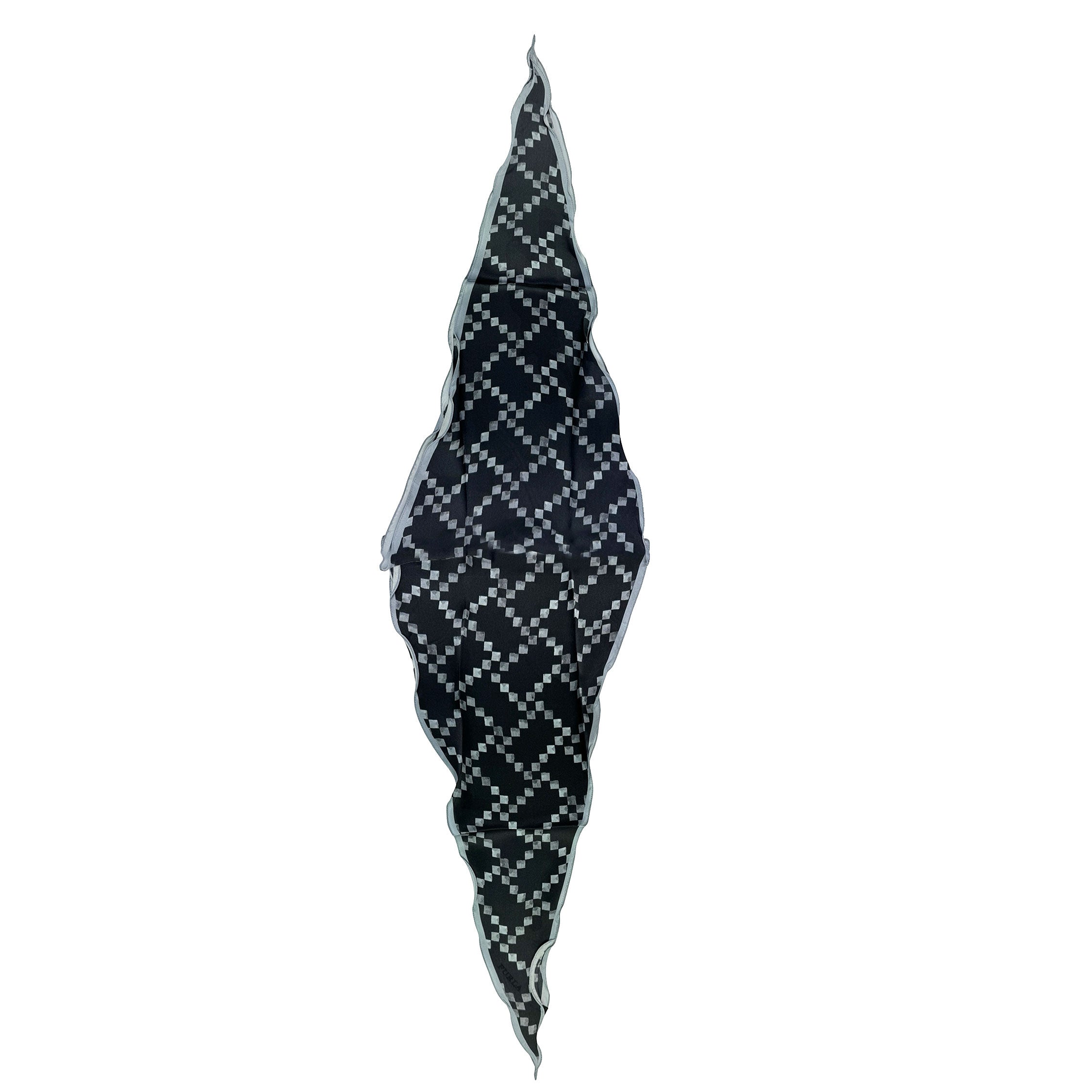 CLEARANCE - Genuine Furla scarf, diamond shape, black gray design, light weight silk, made in Italy. Can be worn as a small scarf or an accessory for your hand bag or wrist. Authentic Furla women designer scarves, Italian quality accessories at outlet prices.