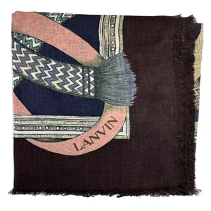 Genuine Lanvin scarf, dark brown with light pink and midnight blue-gray center design, modal/ cashmere, extra large square, short eyelash fringe border, made in Italy. Authentic Lanvin scarves, women collection accessories at outlet prices.