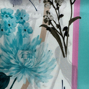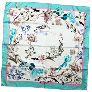 Genuine Laura Biagiotti scarf, pink taupe white floral with powder blue border design, large 36" square silk scarf, made in Italy. Shop for genuine discount women design scarves online, luxury Italian women scarves.