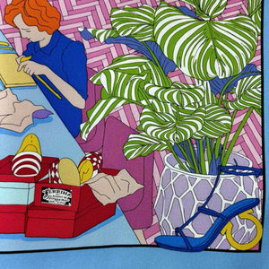 Authentic Salvatore Ferragamo scarf, 'Atelier' design in blue/ pink, hand stitched edges, large twill silk foulard, made in Italy. Authentic Salvatore Ferragamo designer scarves at outlet prices.