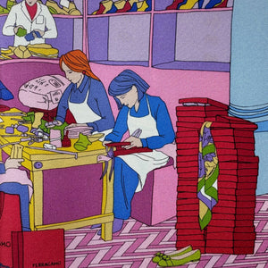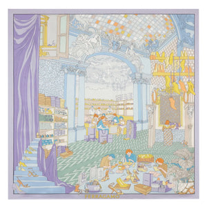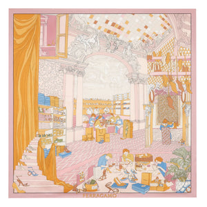 Atelier: Part of a graphic narrative that began a few seasons ago, this scarf features a multicolor print inspired by the Ferragamo world. Like a Renaissance painting, the scene is depicted with a wealth of detail: brand symbols, the shapes of Marilyn Monroe's shoes and the contrast between archival and new packaging are just some of the elements that make it a true tableau vivant to be explored at leisure.