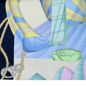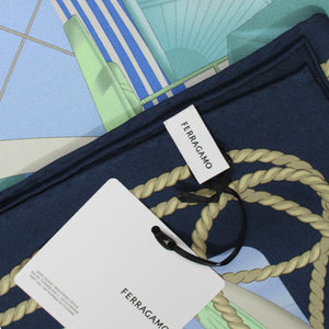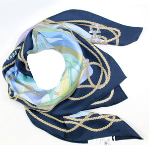 Authentic Salvatore Ferragamo scarf, navy blue 'Sailing' design, hand stitched edges, large twill silk foulard, made in Italy. Authentic Salvatore Ferragamo designer scarves at outlet prices.
