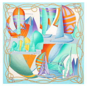 Sailing: A new pure silk scarf features a macro print dedicated to the world of sailing: with bold pop art strokes, boats, carabiner clips, ropes, and sailing ships harmoniously fill the space, presented in delicately matched hues. The signature logo is woven into the pattern, the edges are hand-finished.