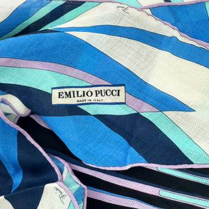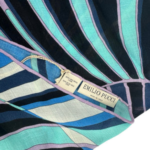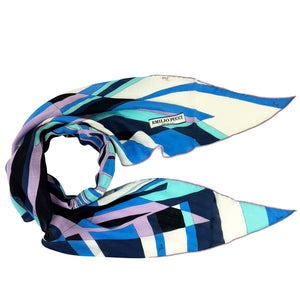 Genuine Emilio Pucci scarf, blue design, large diamond shape, wool/ silk, made in Italy. Authentic silk Emilio Pucci scarves and accessories, women collection, at outlet prices.