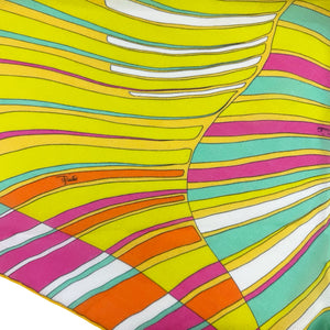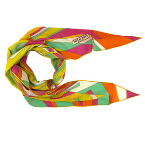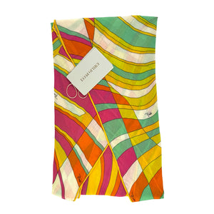 Authentic Emilio Pucci scarf, yellow orange fuchsia design, large diamond shape, wool/ silk, made in Italy. Genuine silk Emilio Pucci scarves and accessories, women collection, at outlet prices.