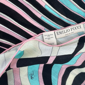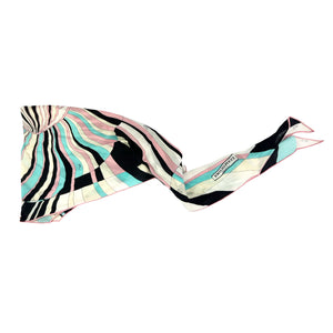 Genuine Emilio Pucci scarf, silk, signature design with sky blue light pink, diamond shape, silk, made in Italy. Authentic silk Emilio Pucci scarves and fashion accessories, women collection, at outlet prices.