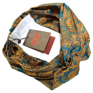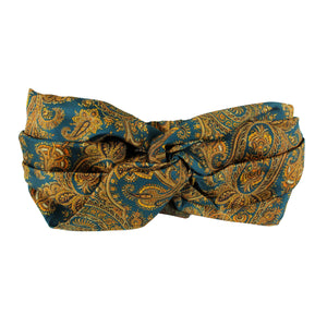 - FINAL SALE - Women collection: Genuine Etro twisted head scarf turban with dark turquoise orange-gold paisley design, twill silk, elastic stretch (at back section), made in Italy. Authentic Etro women collection at outlet prices.