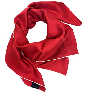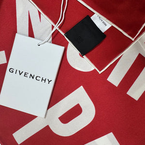 Genuine Givenchy scarf, twill silk, red "Givenchy Couture Paris Est 1952" design, white hand stitched edges, made in Italy. Authentic Givenchy collection online, unisex scarves/ shawls at outlet prices.