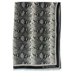 Genuine Givenchy scarf, beige/ black snakeskin design, very soft cashmere silk blend, large square white paisley 4G shawl, short eyelash fringe, made in Italy. Authentic Givenchy collection online, women designer scarves/ shawls at outlet prices.