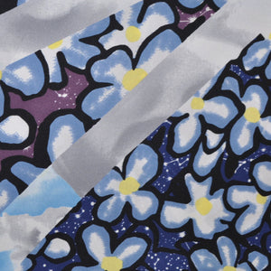 Women collection: Genuine Kenzo scarf with midnight blue/ gray/ purple flowers and stars/ horoscope, 'cloudy' squares print, black border, large square scarf, twill silk, hand made in Italy. Kenzo women collection, discount designer women scarves online.