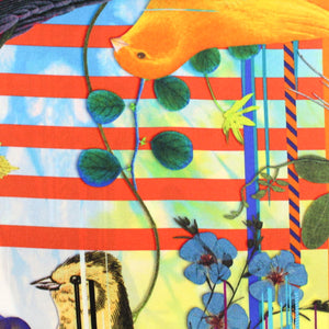 Silk scarves with birds design: Christian Lacroix scarf, yellow / blue / orange birds design, twill silk large square scarf, hand stitched borders, made in Italy. Genuine silk square women scarf by Christian Lacroix, luxury Italian women scarves and shawls.