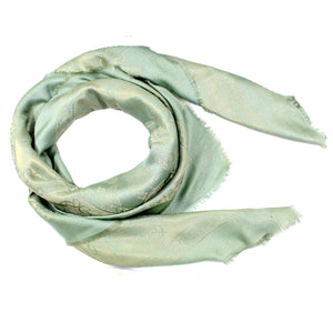 SALE - Fall/ winter collection: Authentic Elie Saab scarf, light green gold floral design, woven wool silk blend, extra large 55" square, made in Italy, short eyelash fringe. Genuine Elie Saab collection, discount women designer scarves/ stola and shawls.
