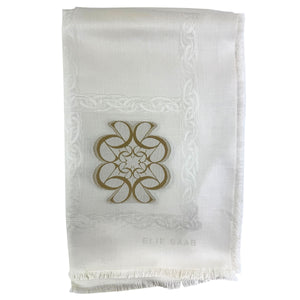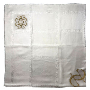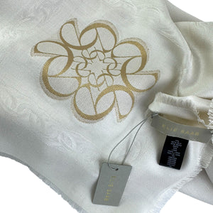SALE - Fall/ winter collection: Authentic Elie Saab scarf, white tonal logo with taupe-gold logos, woven wool-silk blend, extra large 55" square, short eyelash fringe, made in Italy, short eyelash fringe. Genuine Elie Saab collection, discount women designer scarves/ stola and shawls.
