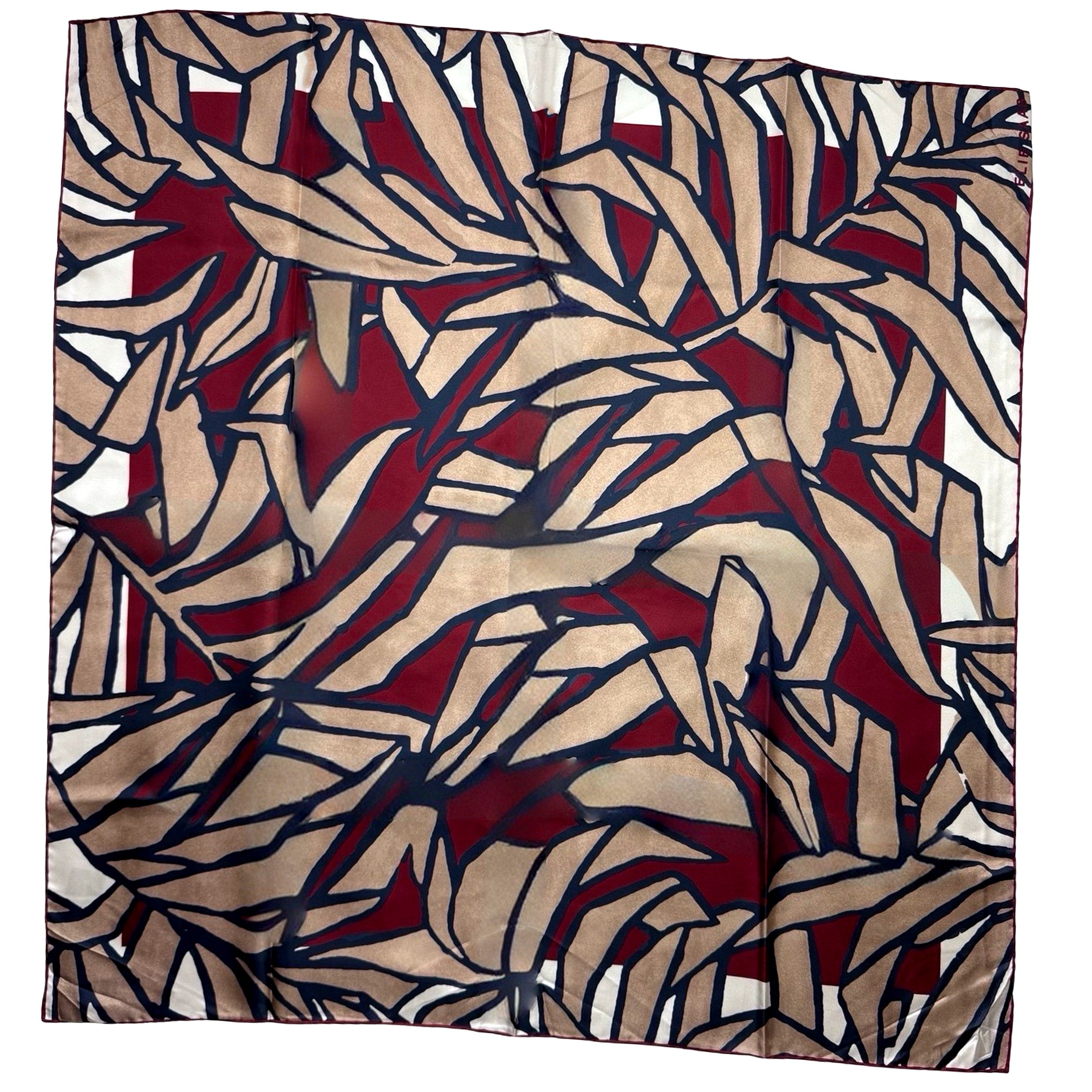 Authentic Elie Saab scarf, abstract floral - marron taupe-beige white and navy design, twill silk, no fringe, hand stitched borders, made in Italy. Genuine Elie Saab collection, discount women designer scarves/ wraps and shawls.