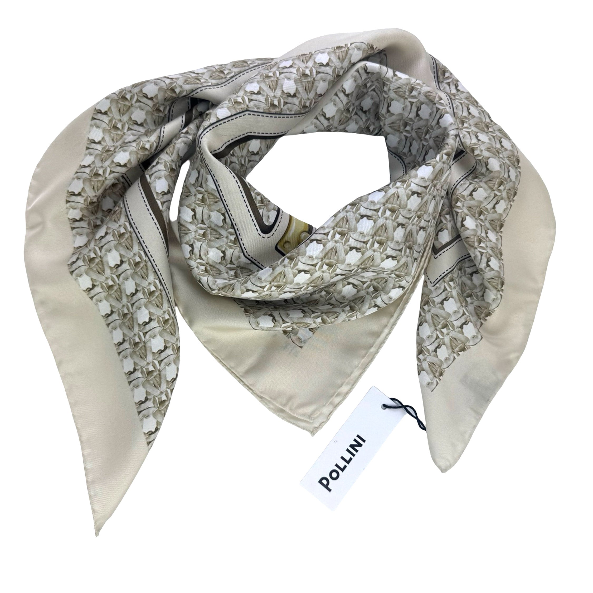 Genuine Pollini scarf, beige with black brown border, twill silk square foulard, hand stitched borders, made in Italy. Shop Pollini scarves.