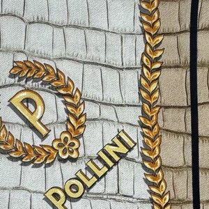 Genuine Pollini scarf, white beige gold brown design, twill silk square foulard, hand stitched borders, made in Italy. Shop Pollini scarves.