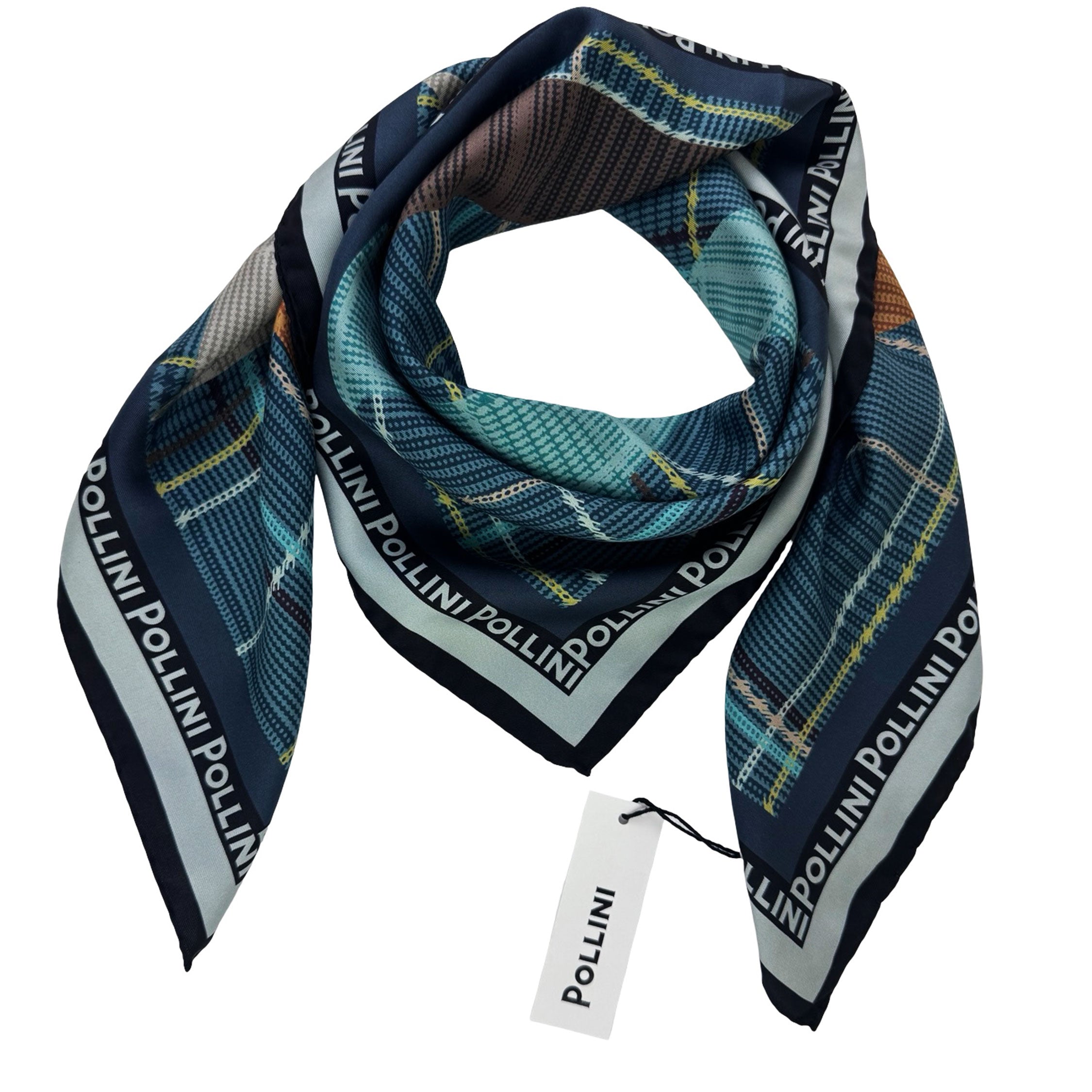 Pollini Silk Scarf Teal Plaid Logo Design - Large Square 36" Foulard