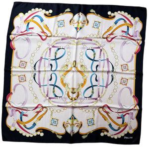 Genuine Pollini scarf, pink lavender belts design with black border, twill silk square foulard, hand stitched borders, made in Italy. Shop Pollini scarves.