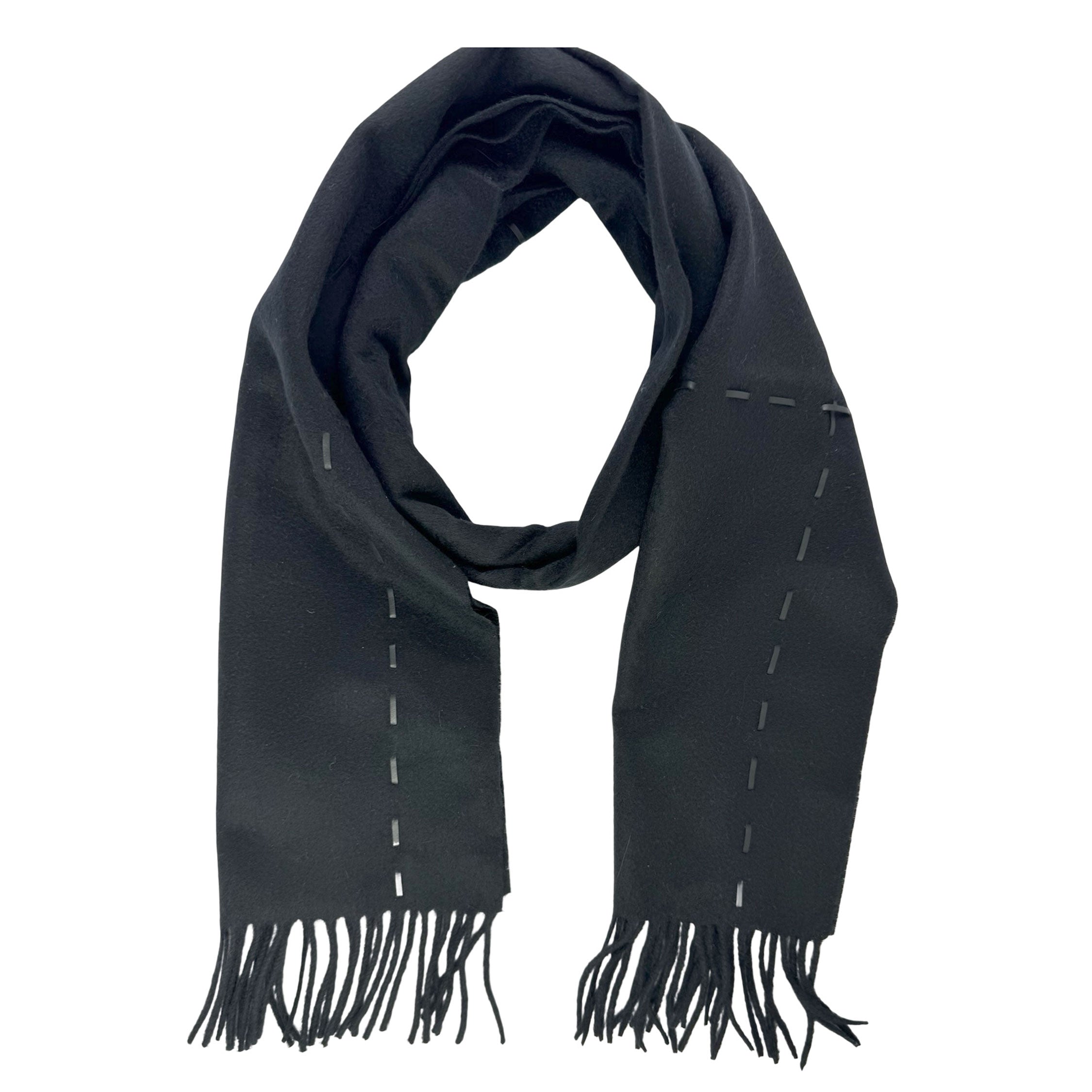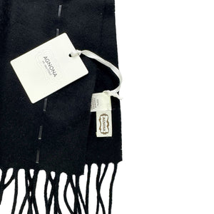 Unisex: Luxury Cashmere: Authentic Agnona scarf, black solid with leather stitch detail, long fringe, cashmere/ cotton, made in Italy. Authentic Agnona Scarves, women collection scarves and soft accessories at outlet prices.