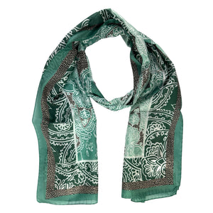 Genuine Borbonese scarf, green black paisley floral with signature Eye of Partridge detail design in pink logo edge, light weight silk, no fringe, made in Italy. Authentic Borbonese women designer scarves, Italian quality accessories at outlet prices.
