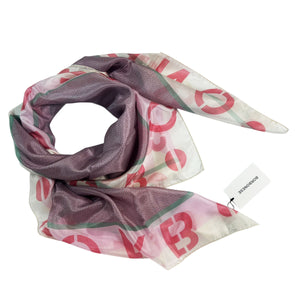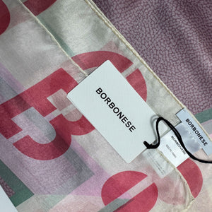 Genuine Borbonese scarf, purple Eye of Partridge and logo design, extra large square, light weight twill silk, hand stitched borders, made in Italy. Authentic Borbonese women designer scarves, Italian quality accessories at outlet prices.
