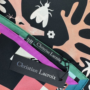 Authentic Christian Lacroix scarf, original interpretation of the tree of life, twill silk square scarf, hand stitched borders, made in Italy. Genuine women designer scarves by Christian Lacroix, discount luxury Italian women scarves and shawls.