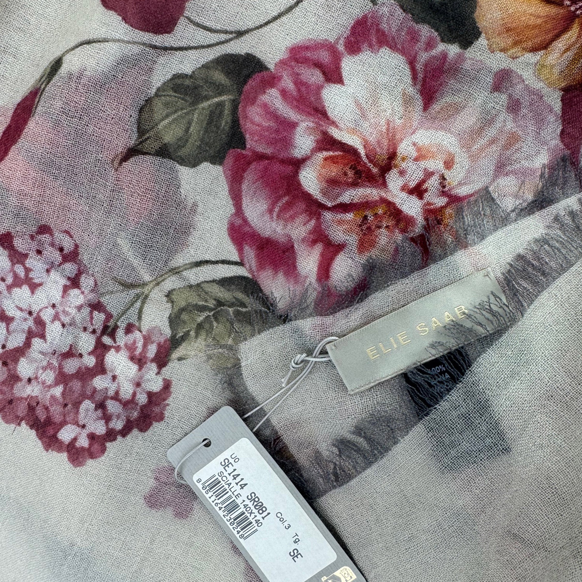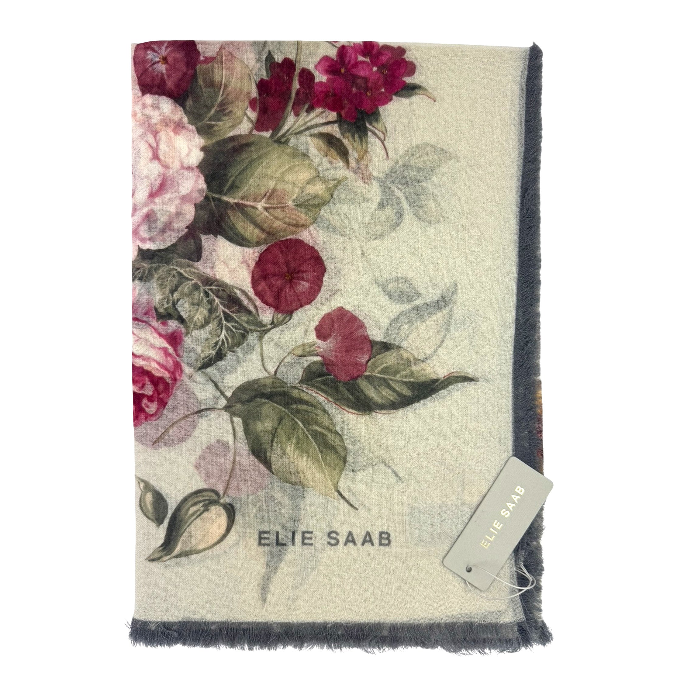 Luxury: Authentic Elie Saab scarf, gray floral bouquet, lightweight soft wool, shoort eyelash fringe, made in Italy. Genuine Elie Saab collection, discount women designer scarves/ wraps and shawls.