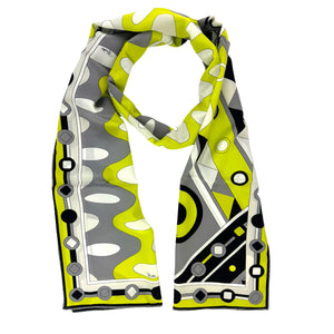 Genuine Emilio Pucci scarf, lime gray black signature design, lightweight silk, made in Italy. Authentic silk Emilio Pucci scarves and accessories, women collection, at outlet prices.