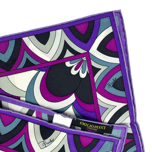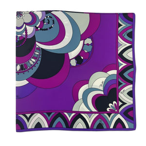 Genuine Emilio Pucci small square scarf, purple gray design, twill silk, hand stitched border, made in Italy. Authentic silk Emilio Pucci scarves and accessories, women collection, at outlet prices.