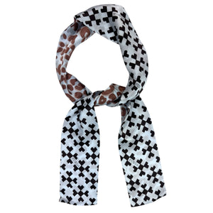 - CLEARANCE - Genuine Furla bandeau scarf (twilly), dark brown (black) white/ mauve pink geometric design with reverse animal print, light weight twill silk, made in Italy. Authentic Furla women designer scarves, Italian quality accessories at outlet prices.