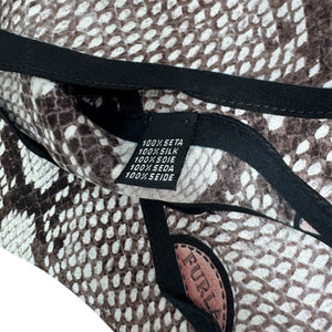 Genuine Furla scarf, diamonds shape, black dark brown snake skin design, light weight twill silk, made in Italy. Can be worn as small scarf or accessory for hand bag or wrist. Authentic Furla women designer scarves, Italian quality accessories at outlet prices.