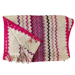Women collection: Authentic Missoni scarf, purple white pink with sprankling beige gold chevron, soft viscose/ cotton fabrics, fringe, made in Italy. Genuine Missoni scarves at outlet prices, women collection, quality designer shawls, made in Italy.