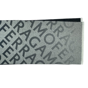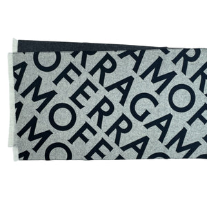 - sale -Genuine Salvatore Ferragamo scarf, gray logo allover / macro lettering design, short eyelash fringe, wool/ cashmere, short eyelash fringe, made in Italy. Authentic Salvatore Ferragamo women collection. Shop for genuine Salvatore Ferragamo scarves, women collection.