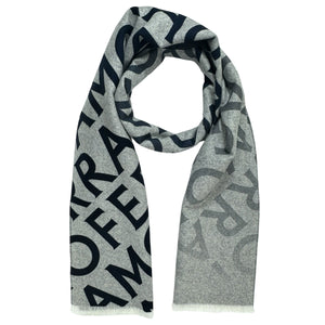 A new take on the metropolitan scarf, crafted from wool and cashmere. One side is solid color, while the other boasts a macro-lettering pattern in a contrasting ombré hue. Mini fringing on hem.