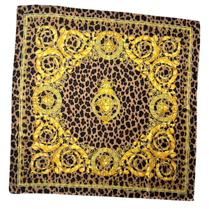 Popular new design: Authentic Versace scarf signature brown black gold barocco Medusa and leopard design, hand stitches borders, made in Italy. Genuine Versace collection - luxury women scarves at outlet prices.