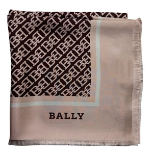 Genuine Bally scarf, brown light pink B logo design with short eyelash fringe, silk, made in Italy. Authentic Bally women collection. Women designer scarves, more square silk foulards at outlet prices.