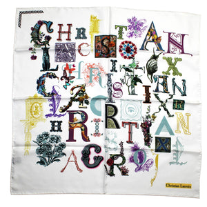 SALE : Genuine Christian Lacroix scarf, navy with colorful letter design, twill silk square scarf, hand rolled borders, made in Italy. Genuine women scarf by Christian Lacroix, luxury women scarves and shawls.